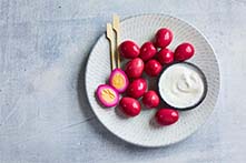 Our ready-to-eat Beetroot Quail Eggs with Sour Cream and Goats Cheese Dip are back in stock, exclusive to Waitrose.