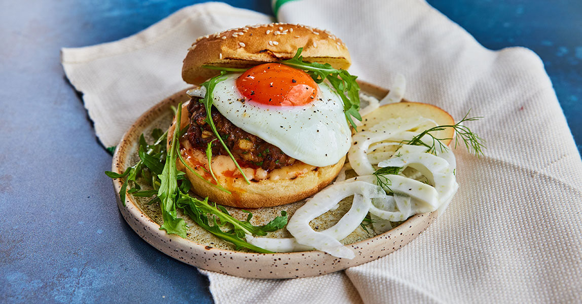 Making a good burger is one of the ultimate pleasures in cooking and eating! We’ve been inspired by flavours from Spain to create this irresistible chorizo burger with smoky paprika and an oozy fried egg. A crunchy and citrusy salad of fennel, apple and rocket brings the zing and added texture along with a good dollop of homemade garlic mayo. Find the recipe for the quick mayo on our website.