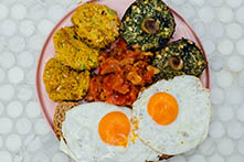 Finally, toast the sourdough until golden brown and  in a large frying pan, then fry the 4 remaining eggs in a little olive oil. Cook them sunny side up for 2-3 minutes until the white is cooked through but the yolk is still a little runny. Season the eggs with salt, plate everything together and enjoy!