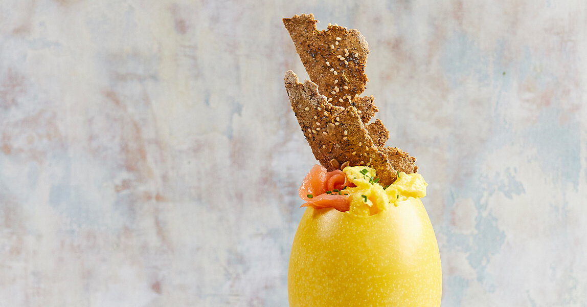 This is a simple and elegant way of presenting a beautiful yellow shelled Rhea egg for a brunch with friends. You’ll have enough to serve up to 12 guests. Make your own cracker bread or serve with your favourite shop bought variety.