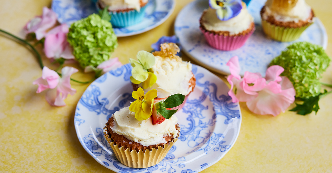 To finish the cupcakes, mix the jam in a bowl until spoonable. Use a teaspoon or melon baller to remove the core of each cupcake. Brush the centre of the cupcakes with the tea and honey syrup. Spoon the jam into the holes. Pipe or spread the icing on top of each cake and arrange the pieces of honeycomb, flowers, and berries to finish.